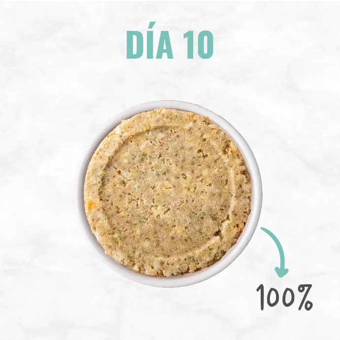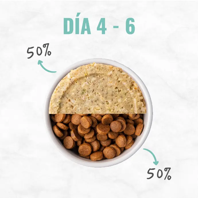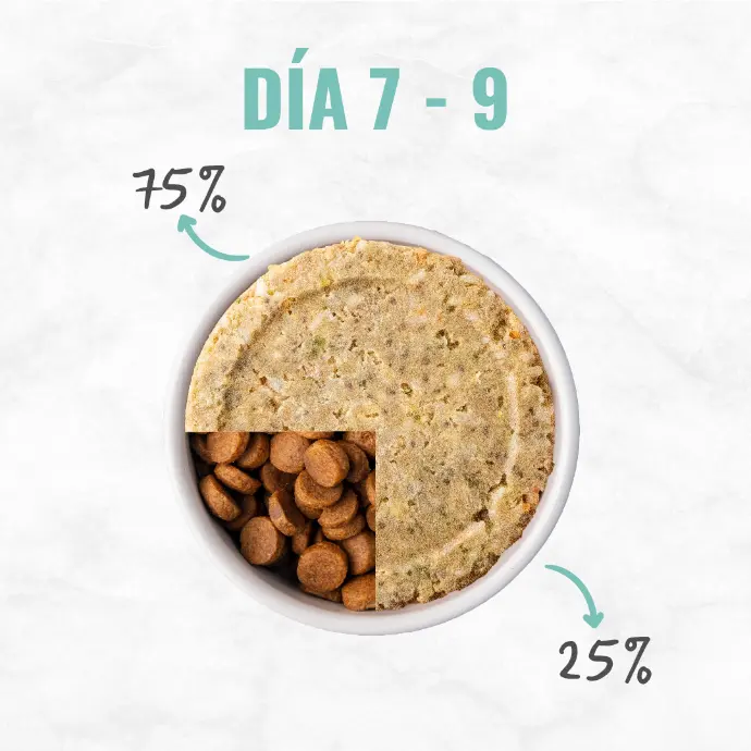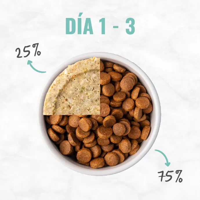 Por ser alimento fresco, la transición es más fácil y más rápida. Para una transición progresiva, sugerimos los siguientes pasos: